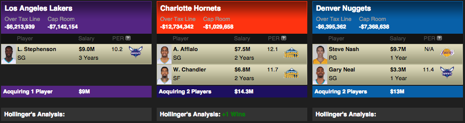 DEN gets: Steve Nash, Gary Neal, 2015 1st Rd Pick (CHA), 2016 2nd Rd Pick (LAL)