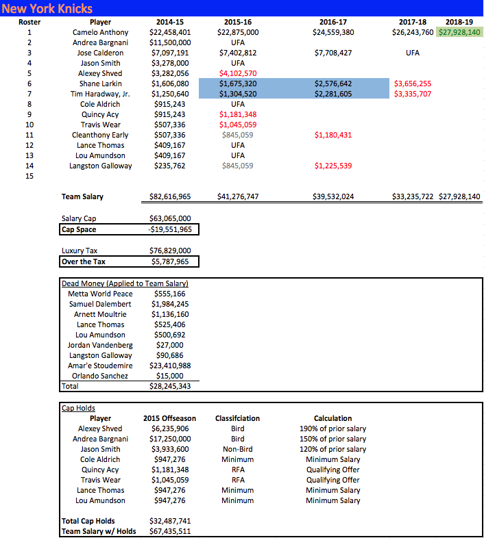 - Amar’e Stoudemire was bought out by the Knicks. Terms were not released so his full salary is applied to dead money. When the terms of the buyout are released, his dead money amount will be updated if necessary.
